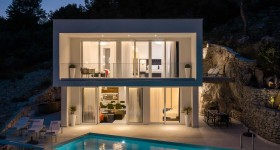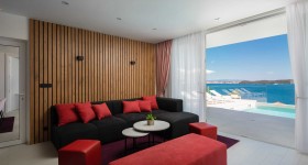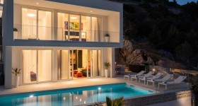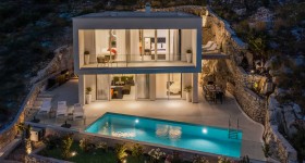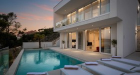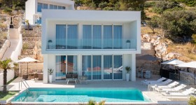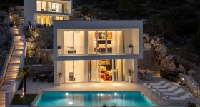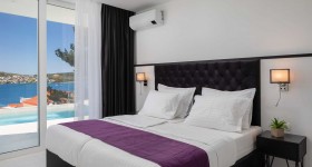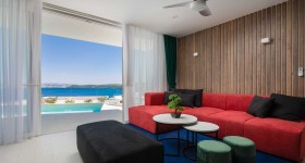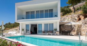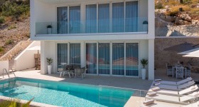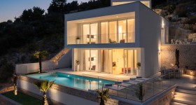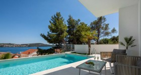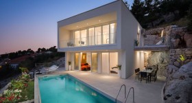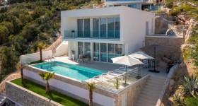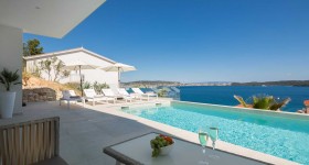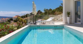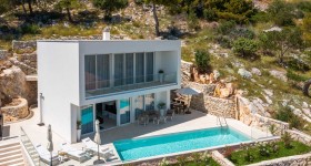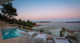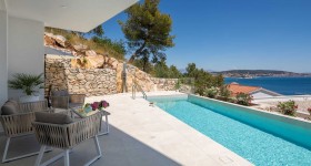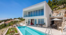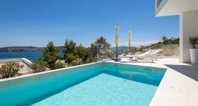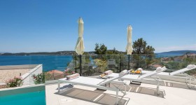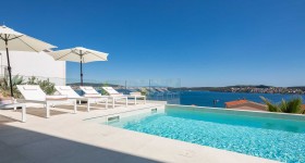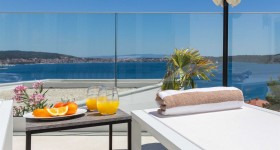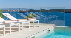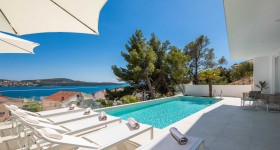 Modern 4-bedroom holiday rental near Trogir at just 200 meters distance to the beach Villa Adria View with Heated Pool II offers a luxurious retreat for private groups of up to 8 guests or for families with children. With its elevated position, perched in a coastal slope, as its name suggests, this lavish villa offers stunning panoramic views of the Adriatic Sea and the islands in front.