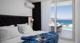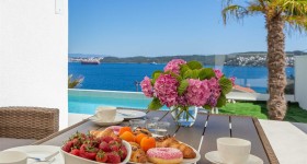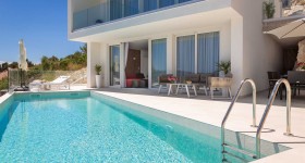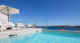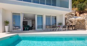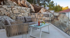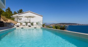 Enjoy the magnificent views of the crystal-clear bay from the outdoor terrace. The swimming pool is heated. Around the pool, you will find comfortable beach chairs on which you can relax and soak up the sun while sipping a refreshing drinks. The barbecue and dining area for 8 are at your disposal for preparing and enjoying delicious meals al fresco under the starry sky.